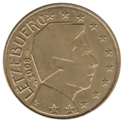 Sur les pièces de 10 à 50 centimes, les étoiles et le nom du pays émetteur forment ce cercle. Le nom du pays LËTZEBUERG est indiqué à gauche avec le millésime juste en dessous, dans la nuque du grand-duc.
