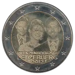 Le Grand-Duc Henri derrière le couple princier (la princesse Stéphanie à gauche et le prince Guillaume à droite). Devant eux, la légende PRËNZENHOCHZÄIT (mariage princier), le nom du pays émetteur LËTZEBUERG et le millésime 2012. L'anneau extérieur de la pièce comporte les douze étoiles du drapeau européen.