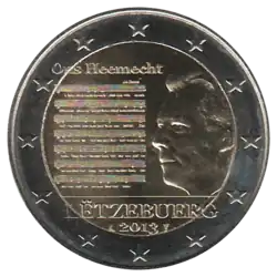 L'effigie du Grand-Duc Henri, à droite, et la partition de l'hymne national à gauche, sous le texte Ons Heemecht. En bas, le nom du pays émetteur LËTZEBUERG et le millésime 2013. L'anneau externe de la pièce comporte les douze étoiles du drapeau européen.