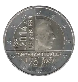 L'effigie du Grand-Duc Henri, tournée vers la droite. À gauche, en vertical, l'année 1839, le millésime 2014 et le nom du pays émetteur LËTZBUERG. Au bas, la légende ONOFHÄNGEGKEET (indépendance) et 175 Joër (175 ans). L'anneau externe de la pièce comporte les douze étoiles du drapeau européen.