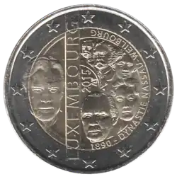 Sur la partie gauche, l'effigie du Grand-Duc Henri. Sur la partie droite, en arc de cercle, les effigies des 5 premiers monarques de la dynastie Nassau-Weilbourg, de plus en plus grandes, dans l'ordre de règne, en commençant en haut: Adolphe (1890-1905), Guillaume IV (1905-1912), Marie-Adélaïde (1912-1919), Charlotte (1919-1964) et Jean. Les deux parties sont séparées par la mention du pays émetteur en vertical LUXEMBOURG et par le millésime 2015 au centre de la pièce, également en vertical. À droite la légende 1890 - DYNASTIE NASSAU-WEILBOURG. L'anneau externe de la pièce comporte les douze étoiles du drapeau européen.