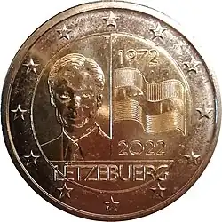 À gauche, portrait en buste du Grand-Duc Henri; à droite, le drapeau tricolore luxembourgeois (les couleurs rouge-blanc-bleu étant reproduites selon les conventions héraldiques) encadré par les années 1972 (au-dessus), et 2022 (en dessous). Le nom du pays émetteur, LËTZEBUERG est inscrit dans la partie inférieure. L’anneau extérieur de la pièce comporte les douze étoiles du drapeau européen.
