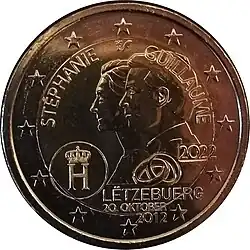 héritière Stéphanie. Près des effigies apparaissent leurs noms respectifs sous forme semi-circulaire. Deux alliances figurent à gauche du millésime 2022. Au bas du dessin sont écrites la mention du pays émetteur, «LËTZEBUERG», et la date du mariage, «20 Oktober 2012». Le monogramme (lettre «H» surmontée d’une couronne) représente le Grand-Duc Henri.