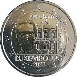 Le dessin représente à gauche l’effigie du grand-duc Henri et, à droite, le bâtiment de la Chambre des députés. L’année «1848» et le texte «Chambre des députés» apparaissent au-dessus et à droite du bâtiment. En bas au centre figurent le nom du pays émetteur, «LUXEMBOURG», ainsi que le millésime, «2023».