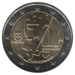La ville de Guimarães est représentée par trois de ses symboles: une représentation stylisée du roi Alphonse-Henri, de son épée et d'une partie du château de la ville. À gauche, les armoiries portugaises au-dessus du nom du pays émetteur PORTUGAL. En bas à droite, le logo de l'événement avec la mention GUIMARÃES 2012. L'anneau extérieur de la pièce comporte les douze étoiles du drapeau européen.