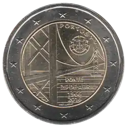 Représentation du Pont du 25 avril, premier pont suspendu au-dessus du Tage, appelé Pont Salazar à l'origine. L'eau est stylisée par des lignes horizontales parallèles. Au-dessus du pont, les armoiries du Portugal et la mention du pays émetteur PORTUGAL. Sous le pont, son nom PONTE 25 DE ABRIL, l'année de sa construction 1966 et le millésime 2016.