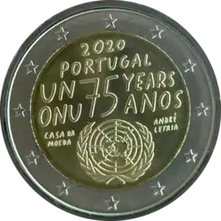 Emblème de l'Organisation des Nations unies sous le sigle de l'organisation en anglais et portugais UN et ONU, l'un en-dessous de l'autre, suivi du nombre 75 et des mots YEARS et ANOS (ans en anglais et portugais). En haut, le millésime 2020 et la mention du pays émetteur PORTUGAL. L'anneau externe de la pièce comporte les douze étoiles du drapeau européen.