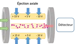 - Avec le piège ionique linéaire, il est possible d’effectuer deux types d’expulsion, contrairement à la trappe trois dimensions qui expulse les ions exclusivement sur l’axe z. L’expulsion radiale permet l’utilisation de deux détecteurs distincts, tandis que le mode axial est restreint à un seul détecteur.