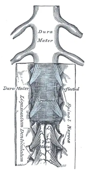 Diagramme représentant une section transversale de la moelle épinière et de ses membranes. (La bordure noire représente la dure-mère, la bleue l'arachnoïde, et la rouge la pie-mère.)