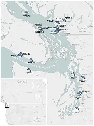 Entre le et le , 19 pieds ont été retrouvés dans la province canadienne de Colombie-Britannique et quatre dans l'État de Washington.