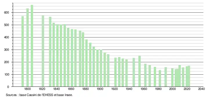 L'évolution du nombre d'habitants est connue à travers les recensements de la population effectués dans la commune depuis 1793. Pour les communes de moins de 10 000 habitants, une enquête de recensement portant sur toute la population est réalisée tous les cinq ans, les populations de référence des années intermédiaires étant quant à elles estimées par interpolation ou extrapolation[26]. Pour la commune, le premier recensement exhaustif entrant dans le cadre du nouveau dispositif a été réalisé en 2004[27].