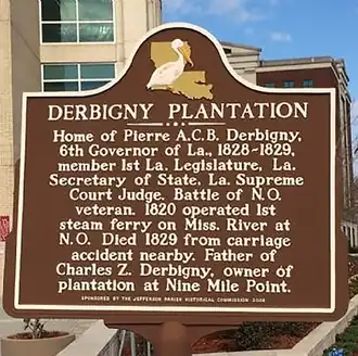 Son fils Charles Zénon Derbigny arrêta ses études de médecine à Paris pour revenir immédiatement à la Nouvelles Orléans pour exploiter les plantations de sucre de la famille à lafourche et à Jefferson Parishes. Il entra en politique et fut un temps président du sénat mais sera battu aux élections au poste de gouverneur.