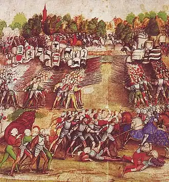 Bataille de Fornoue en 1495 opposant troupes françaises et italiennes. Le roi de France Charles VIII est représenté à gauche, le chevalier Bayard à droite. Peint par Eloi-Firmin Féron en 1837