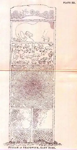 Cette pierre fut trouvée à Shandwick, au sud de Balintore, dans l'Easter Ross, en raison de quoi elle est aussi appelée pierre de Shandwick. Il s'agit d'une classe 2 avec la croix d'un côté et une scène laïque de l'autre, en six panneaux :
