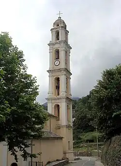 À l'église principale est accolée une chapelle de confrérie (Santa Croce), et les deux façades contiguës forment un ensemble original. L'ensemble est flanqué sur sa façade latérale septentrionale, d'un campanile ajouré de cinq étages, qui mesure 38 mètres de haut ; c'est l'un des plus hauts de Corse.