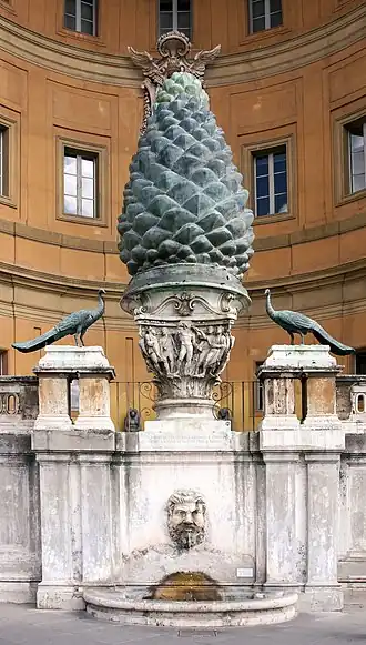 La Pigna est placée au sommet d'un double escalier conçu par Michel-Ange, devant la niche. Sur sa base, œuvre du IIIe siècle, provenant des thermes de Néron, se trouve l'inscription « Couronnement d'un athlète victorieux », entourée de deux paons en bronze (des copies, les originaux antiques étant conservés au musée Chiaramonti) de l'époque d'Hadrien, provenant probablement du mausolée d'Hadrien.