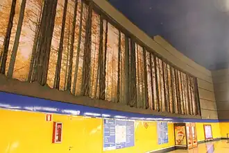 Le vestibule intérieur de la station est décoré par un mur métallique de 25 m de long sur 5 m de haut qui représente une pinède[6].