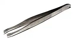 Par extension, dans le domaine de la philatélie, c'est également le nom donné à une petite pince aplatie à l'extrémité de ses deux branches, utilisée pour manipuler les timbres-poste.
