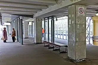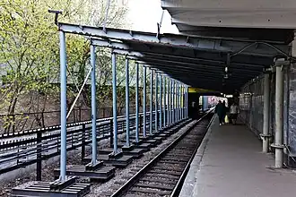 La station dispose d'un guichet dans chacun des deux pavillons d'entrée, situé à la hauteur et de chaque côté de la voie routière qui franchit la ligne, par un pont, au centre de la station. Des escaliers permettent le lien avec le quai central situé en dessous[4],[5].