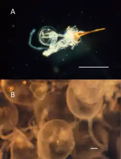 (A) Dard d'une fourmi Pogonomyrmex montrant l'aiguillon, la glande de Dufour, et le réservoir à venin sphérique muni d'un long conduit de venin menant à l'aiguillon. (B) Réservoirs de venin isolés.