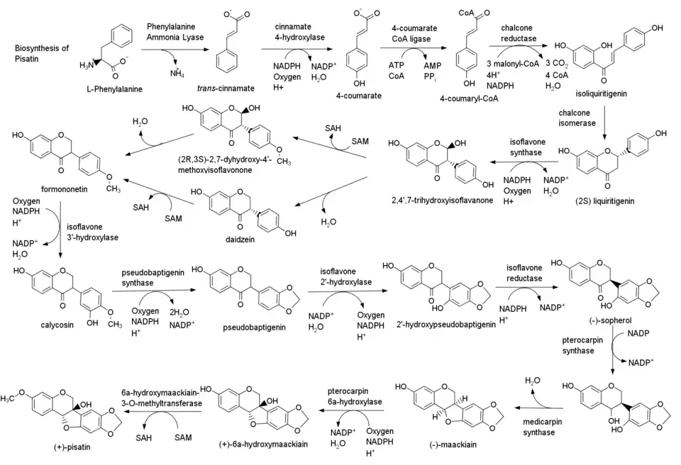 La biosynthèse de la pisatine commence par celle d'un acide aminé, la L-phénylalanine. Une réaction de désamination produit alors de la trans-cinnamate[11], qui subit une hydroxylation pour former de la 4-coumarate[12]. L'acétyl-CoA est ensuite ajouté pour former le 4-coumaryl-CoA[13]. Trois fragments de malonyl-CoA sont ensuite ajoutés et cyclisés pour introduire un cycle phénol[14]. Une réaction d'isomérisation se produit ensuite[15], suivie par une hydroxylation et un réarrangement[16] du groupe phénol pour former la 2,4',7-trihydroxyisoflavonone. Cette molécule peut alors suivre l'une des deux voies possibles, qui impliquent toutes deux la perte d'eau[17] et une méthylation[18],[19] pour produire de la formononétine. Ce produit subit ensuite une hydroxylation pour former la calycosine[20], suivie par la formation d'un anneau de dioxolane[21].