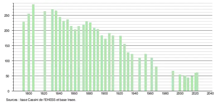 L'évolution du nombre d'habitants est connue à travers les recensements de la population effectués dans la commune depuis 1793. Pour les communes de moins de 10 000 habitants, une enquête de recensement portant sur toute la population est réalisée tous les cinq ans, les populations de référence des années intermédiaires étant quant à elles estimées par interpolation ou extrapolation[14]. Pour la commune, le premier recensement exhaustif entrant dans le cadre du nouveau dispositif a été réalisé en 2005[15].