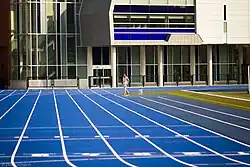Les courses de vitesse, notamment la course phare du 100 mètres, se courent sur une seule portion de la piste : le plus grand côté ; une zone spécifique prolonge la piste, après la ligne d'arrivée, pour permettre aux concurrents de ralentir progressivement. La distance règlementaire de 400 mètres est mesurée à 30 centimètres de la délimitation interne de la piste, aussi appelée la corde.