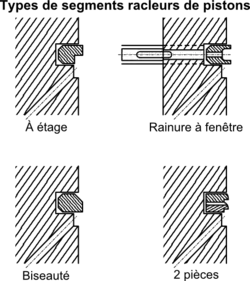 Le nombre de segments est variable d'un moteur à un autre, cependant on en distingue trois types. Les trois types de segments, positionnés dans l'ordre de haut en bas sur le piston, sont :