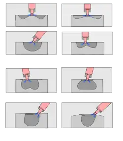 Ces contraintes d'état de surface vont provoquer, lors du déplacement du piston dans la chemise, l'« ouverture et la fermeture de multiples zones convergentes et divergentes de films »[19] d'huile, ce qui complique l'optimisation de la lubrification. Une modélisation de la lubrification de la jupe consiste à considérer l'équation de Reynolds, afin de déterminer les champs de pression et de vitesse, auquel des termes de dérivation croisée sont ajoutés. Une expression du type suivant peut être ajoutée à l'équation de films minces[19] :