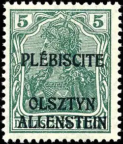 Timbre allemand de 1920 d'une valeur de 5 pfennigs portant la mention Plébiscite ainsi que le nom de la ville d'Allenstein en polonais et en allemand.