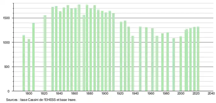 L'évolution du nombre d'habitants est connue à travers les recensements de la population effectués dans la commune depuis 1793. Pour les communes de moins de 10 000 habitants, une enquête de recensement portant sur toute la population est réalisée tous les cinq ans, les populations de référence des années intermédiaires étant quant à elles estimées par interpolation ou extrapolation[28]. Pour la commune, le premier recensement exhaustif entrant dans le cadre du nouveau dispositif a été réalisé en 2007[29].