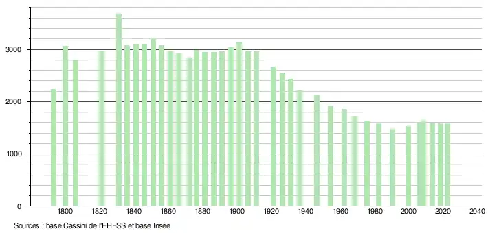 L'évolution du nombre d'habitants est connue à travers les recensements de la population effectués dans la commune depuis 1793. Pour les communes de moins de 10 000 habitants, une enquête de recensement portant sur toute la population est réalisée tous les cinq ans, les populations de référence des années intermédiaires étant quant à elles estimées par interpolation ou extrapolation[26]. Pour la commune, le premier recensement exhaustif entrant dans le cadre du nouveau dispositif a été réalisé en 2008[27].
