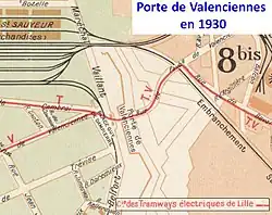 Les lignes de tramway T et V ouvertes le traversent la porte de Valenciennes. La ligne T reliait le centre de Lille à Hellemmes par la rue Cambrai, la ligne V la place Catinat (devant le port Vauban) au Buisson (dans le quartier Saint-Maurice Pellevoisin) en desservant les quartiers sud, Wazemmes et Moulins, puis Fives par un parcours sinueux restant éloigné du centre.