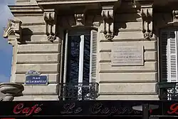 Plaque à la mémoire de Louise de Marillac, piédouche et baldaquin en pierre sculptée de l'ancienne enseigne de la brasserie Le Capucin.