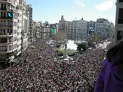 Durant la période des fallas, une partie de la place est entourée d'une grande clôture grillagée, et on y célèbre la mascletà, spectacle pyrotechnique qui a lieu chaque jour à midi. La place héberge également une falla, généralement l'une des plus grandes et coûteuses des festivités.