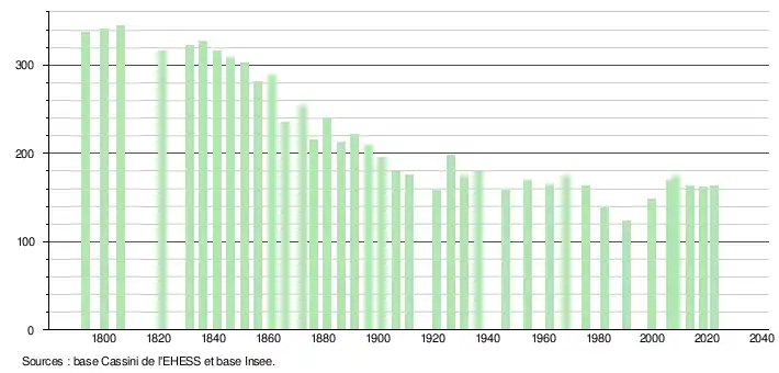 L'évolution du nombre d'habitants est connue à travers les recensements de la population effectués dans la commune depuis 1793. Pour les communes de moins de 10 000 habitants, une enquête de recensement portant sur toute la population est réalisée tous les cinq ans, les populations de référence des années intermédiaires étant quant à elles estimées par interpolation ou extrapolation[23]. Pour la commune, le premier recensement exhaustif entrant dans le cadre du nouveau dispositif a été réalisé en 2008[24].
