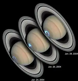 Série de photographies (lumière visible et UV) par le télescope spatial Hubble d'une aurore sur Saturne.