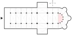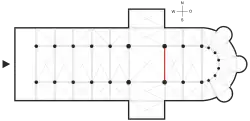 Pseudo-basilique : le vaisseau central a un étage de plus que les collatéraux, mais pas de fenêtres supérieures.