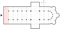 La progression de la description se fait depuis le narthex (extrémité ouest de la nef), vers les chapelles absidiales (à l'extrême est), soit de gauche à droite dans les plans ci-dessus.