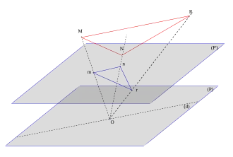 En effet, une telle partition apparaît lorsqu'on fixe un plan affine ne passant pas par l'origine, par exemple le plan d'équation z = 1, et qu'on associe, à chaque droite vectorielle non parallèle à ce plan, son point d'intersection avec ce plan. On met ainsi en bijection avec ce plan affine une partie du plan projectif réel, qu'on appelle partie affine. Les autres droites vectorielles (celles incluses dans le plan d'équation z = 0) constituent une droite projective réelle (en), qu'on appelle droite à l'infini.