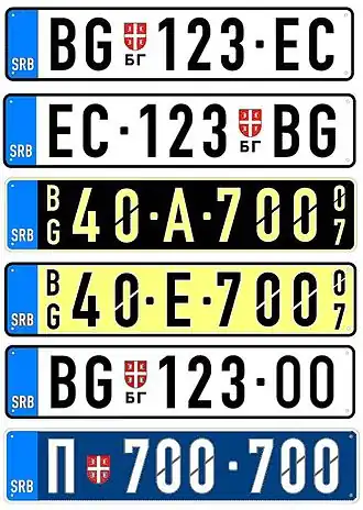 Les plaques d'immatriculation de la Serbie consistent en deux lettres indiquant la provenance, ensuite quatre chiffres et deux autres lettres. Elles utilisent des caractères noirs sur fond blanc.