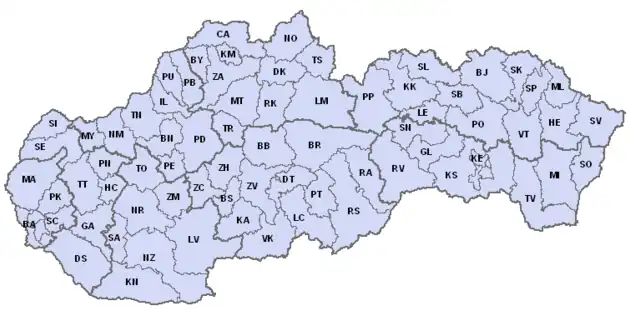 Code de district sur la carte.Jusqu'à l'entrée de la Slovaquie dans l'UE le 1er mai 2004.Jusqu'à juin 2006.Depuis juin 2006.Plaque temporaire pour véhicule en importation.Plaque de concessionnaire.Plaque pour véhicule officiel.Plaque militaire.Plaque diplomatique.