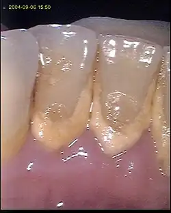 La plaque dentaire est un biofilm surtout composé de Streptococcus mutans, Streptococcus sobrinus et Lactobacillus spp (Selwitz, 2007), qui, en cas de déséquilibre écologique de l'« écosystème buccal », devient responsable de la plupart des maladies parodontales et de la carie dentaire[4]. Dans ce cas ce déséquilibre se fait entre la matière dentaire minérale et les biofilms bactériens de la cavité buccale et de la plaque dentaire. Ces bactéries sont protégées dans leur biofilm, mais en tant que corps étrangers à l'organisme - quand elles entrent en contact avec le sang ou les cellules immunitaires, elles activent normalement une défense immunitaire ; c'est la gingivite, qui peut évoluer en parodontite si la source de l'infection n'est pas traitée.