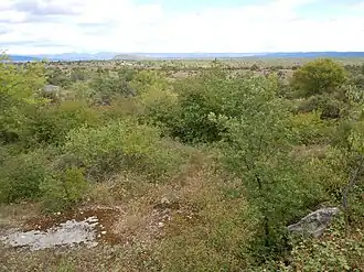 Le plateau supporte des pelouses à Brachypode rameux (Brachypodium ramosum) et à Brome dressé (Bromus erectus), des garrigues à Genévrier oxycèdre (Juniperus oxycedrus ou Cade) et Buis (Buxus), des bosquets de Chêne pubescent (Quercus pubescens), quelques anciens vergers d'amandiers ou de mûriers disséminés. Il recèle des espèces rares et protégées comme l'Alysse à gros fruits (Hormathophylla macrocarpa[3]). "Prairies calcaires subatlantiques très sèches", "pelouses méditerranéennes xériques" et "formations riveraines de Saules" sont trois des cinq habitats déterminants de la ZNIEFF (les deux autres étant les "grottes" et les "lits de graviers méditerranéens").