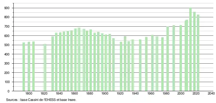 L'évolution du nombre d'habitants est connue à travers les recensements de la population effectués dans la commune depuis 1793. Pour les communes de moins de 10 000 habitants, une enquête de recensement portant sur toute la population est réalisée tous les cinq ans, les populations de référence des années intermédiaires étant quant à elles estimées par interpolation ou extrapolation[33]. Pour la commune, le premier recensement exhaustif entrant dans le cadre du nouveau dispositif a été réalisé en 2007[34].