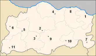 Les noms de localités en caractères gras ont le statut de ville (en bulgare : град, translittéré en grad). Les autres localités ont le statut de village (en bulgare : село translittéré en selo).