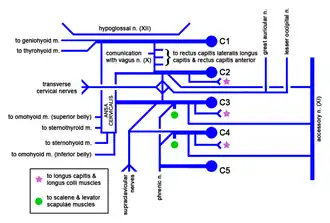 La branche antérieure du premier nerf cervical donne un rameau communiquant avec le nerf hypoglosse. Il suit son trajet dans la même gaine que ce nerf et fournit la racine supérieure de l'anse cervicale et deux branches musculaires pour les muscles génio-hyoïdien et thyro-hyoïdien.