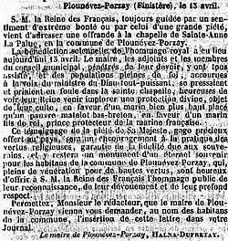 - ↑ L'Ami de la religion et du roi, n° du 25 décembre 1856, consultable https://gallica.bnf.fr/ark:/12148/bpt6k5738002t/f17.image.r=Porzay?rk=836914;0