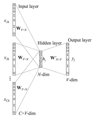 Dans les deux cas, on définit un réseau de neurones artificiels qui a une couche d'entrée , et une couche de sortie . Ces vecteurs sont binaires et de taille . Une couche cachée à dimensions est intercalée entre les deux. est un hyperparamètre d'apprentissage. L'entraînement du réseau produit une matrice de taille , connectée à gauche aux entrées et à droite à la couche cachée. Au terme de l'apprentissage, la matrice contient les plongements de tous les mots du vocabulaire.