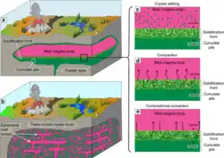 Dans une zone diapirique, le magma primaire remonte vers la surface. Vers 60–50 km de profondeur, le niveau structural devient dur et cassant, favorisant la formation d'un réseau de fractures dans lequel s'injecte ce magma. « Dans la majorité des cas, l'ascension s'arrête en cours de route pour des raisons diverses (modification tectonique ou thermique locale, variation du taux de production magmatique, augmentation de la densité relative magma/encaissant qui limite la « poussée d'Archimède »). Cet arrêt a souvent lieu à la limite entre le manteau et la croûte (30 km de profondeur environ) ou bien au sein même de celle-ci (entre 30 et 10 km). Après un laps de temps donné (quelques siècles ou millénaires), les fractures s'anastomosent. Une poche, remplie de magma, se forme puis s'agrandit par effondrements », formant ainsi une chambre magmatique[7] (modèle classique).